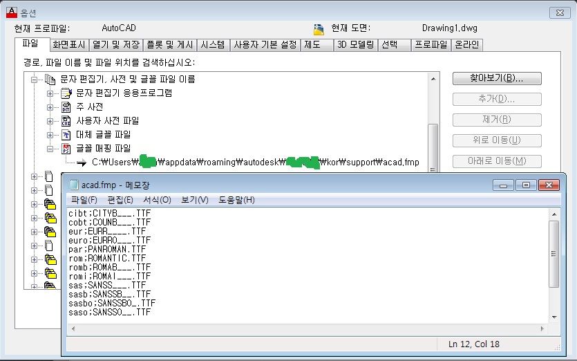 c:\Users\컴터이름\appdata\roaming\autodesk\autocad\kor\support 폴더 내에(컴퓨터 설정마다 다를 수 있음) acad.fmp 파일을 수정하면 된다. (LT버전은 acadlt.fmp)