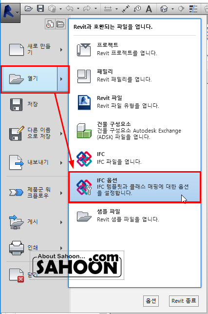 ① R-> 열기 -> IFC옵션을 선택합니다. (IFC옵션이 비활성화 되어있을경우에는 빈 Revit파일 을 만든후에 다시 선택해 보세요)
